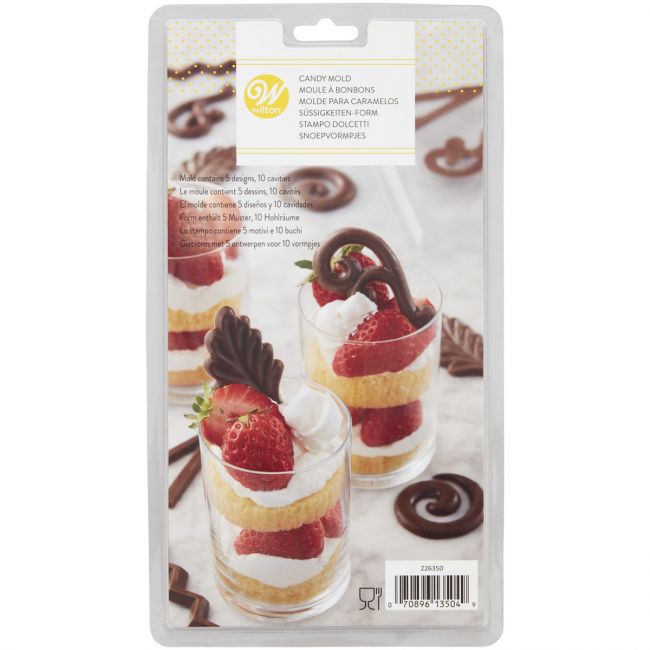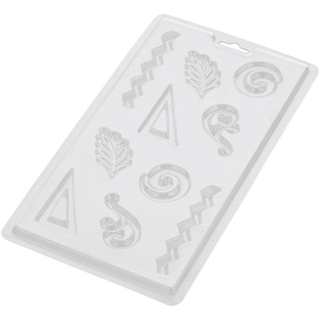 Mit dieser Gießform stellen Sie herrliche Wirbel, Schnörkel, Zickzacks, Dreiecke und Blätter her. Zum Beispiel, um Ihren Eisdessert fantastisch abzurunden, aber auch auf Cupcakes oder Torten. Die Form besteht aus 5 verschiedenen Designs und 10 Förmchen.