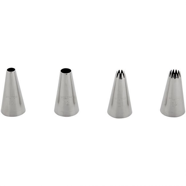 Set, bestehend aus vier Wilton Spritztüllen für Streifen, Bälle, Buchstaben, Perlen, Dropflowers, gezackten Rändern und mehr.