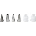 Enthält die runden Spitzen #4 und #12, die Blütenblattspitze #104, die Sternspitze #21, zwei Standardkupplungen, 12 Einwegspritzbeutel und eine Anleitung